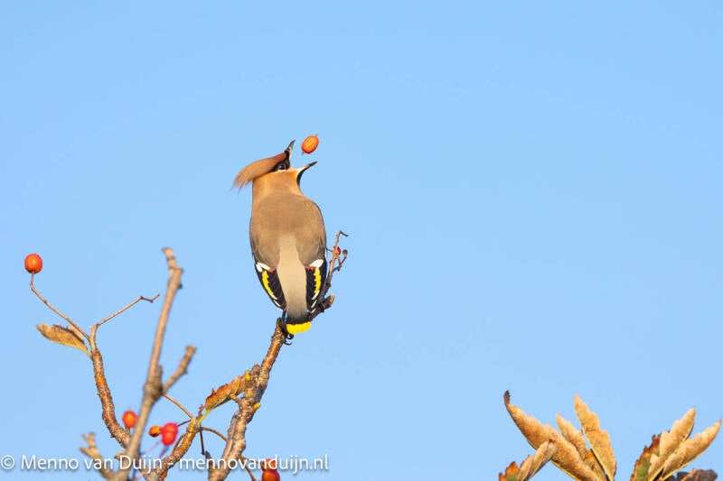 At De Koog two immature Waxwings were reported and together with Sven we visited them. Both birds are immatures (first calendar) as they only have the horizontal line on their primaries and not the arches like adults do. The right bird is a male as the throat patch and bandit mask reaches farther then the left bird, making that a female.